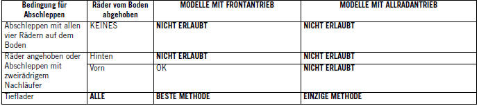 Das Schleppen dieser Fahrzeuge unter Nichtbeachtung der o. g. Anforderungen kann schweren Motor- und/oder Getriebeschaden verursachen. Schäden aufgrund eines nicht korrekten Abschleppens fallen nicht unter die begrenzte Gewährleistung für Neufahrzeuge.