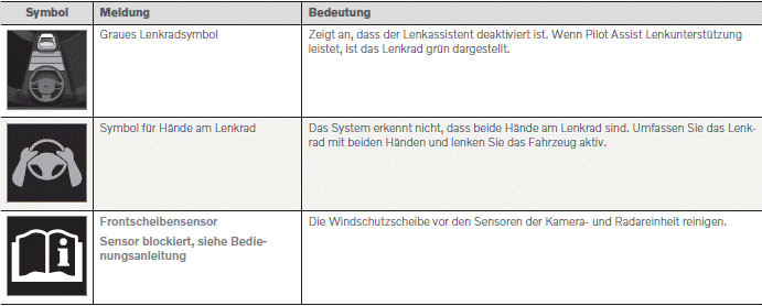 In Verbindung mit Pilot Assist können auf dem Fahrerdisplay und/oder im Head-up-Display eine Reihe von Symbolen und Meldungen erscheinen.