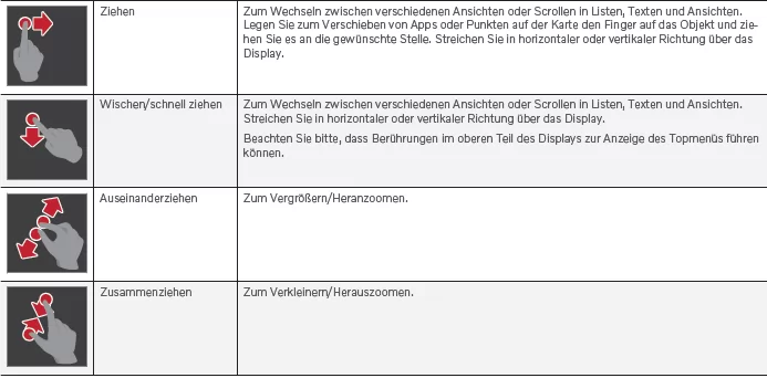 In der folgenden Tabelle sind die verschiedenen Gesten zur Bedienung des Touchscreens aufgeführt: