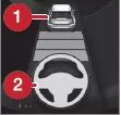 Nur wenn die Farbe des Lenkradsymbols (2) von GRAU zu GRÜN wechselt, ist die Lenkunterstützung durch Pilot Assist aktiviert.
