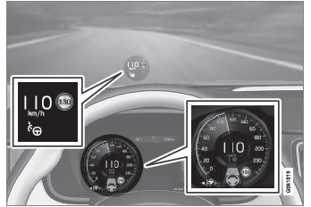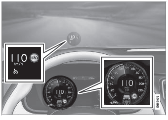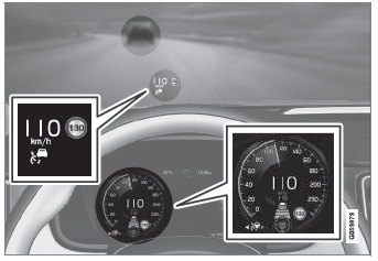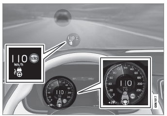 In der obigen Abbildung ist die Funktion Pilot Assist auf 110 km/h (68 mph) eingestellt, und das Fahrzeug folgt einem vorausfahrenden Fahrzeug mit der gleichen Geschwindigkeit.