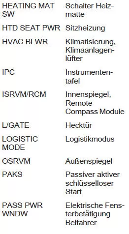 Es empfiehlt sich, stets einen kompletten Satz an Reservesicherungen mitzuführen. Reservesicherungen können im Sicherungskasten im Motorraum aufbewahrt werden.