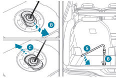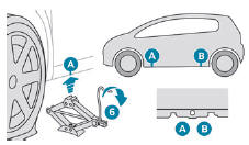 Achten Sie darauf, dass der Wagenheber stabil steht. Wenn der Boden rutschig oder unbefestigt ist, kann es passieren, dass der Wagenheber wegrutscht oder einsinkt - es besteht Verletzungsgefahr! Achten Sie darauf, den Wagenheber ausschließlich an den Ansatzstellen A oder B unter dem Fahrzeug zu positionieren, und vergewissern Sie sich, dass der Kopf des Wagenhebers unter dem Auflagebereich des Fahrzeugs richtig zentriert ist. Ansonsten kann das Fahrzeug beschädigt werden und/ oder der Wagenheber einsinken. Es besteht Verletzungsgefahr!