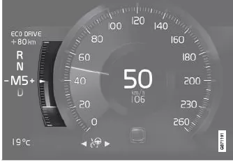 Außerdem gibt die ECO-Anzeige die optimale Fahrweise unter den aktuellen Bedingungen an. Dies wird durch den kürzeren Zeiger auf dem Messinstrument angezeigt.
