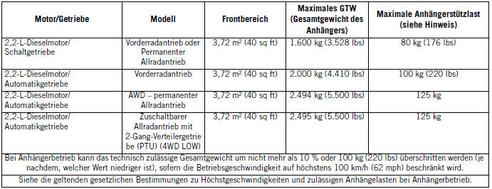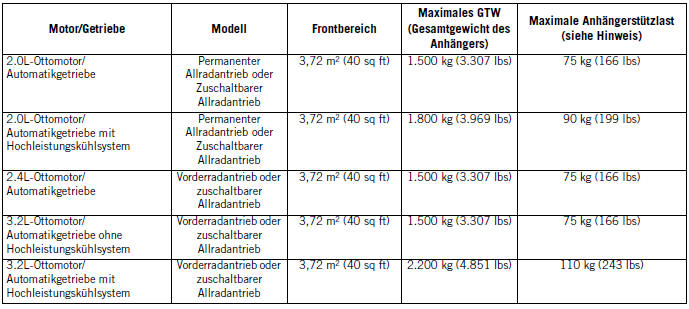 Trailer Towing Weights (Maximum Trailer Weight Ratings) (Maximal zulässige Gewichte des Anhängers)