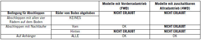Ein Abschleppen dieses Fahrzeugs mit BELIEBIGEN Rädern auf dem Boden kann schwere Schäden am Getriebe und/oder Verteilergetriebe verursachen. Schäden aufgrund eines nicht korrekten Abschleppens fallen nicht unter die begrenzte Gewährleistung für Neufahrzeuge.