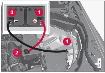 8. Die andere Klemme des schwarzen Startkabels an den Starthilfe-Minuspol (4) des Fahrzeugs anschließen.