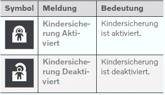Wenn die Kindersicherung beim Ausschalten des Fahrzeugs aktiviert ist, dann ist sie beim erneuten Einschalten des Fahrzeugs weiterhin aktiv.