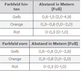 Mit sinkendem Abstand zum Hindernis ändert sich die Farbe des Felds für die Heck- und Frontsensoren von GELB über ORANGE zu ROT.