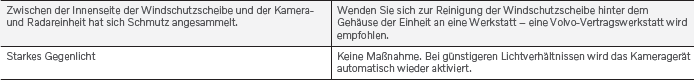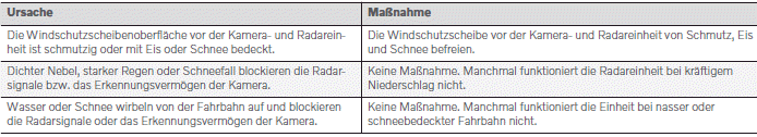 Bei sehr hohen Temperaturen im Fahrzeuginnenraum kann sich die Kamera- und Radareinheit für ca. 15 Minuten nach Starten des Motors vorübergehend ausschalten, um die Elektronik zu schützen. Sobald die Temperatur ausreichend gesunken ist, startet die Kameraund Radareinheit automatisch neu.