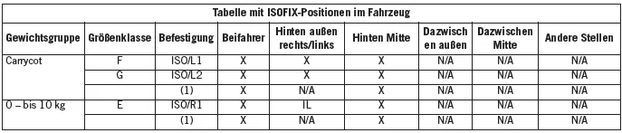 Die folgende Tabelle gemäß europäischem Standard ECE 129 zeigt die Einbau-Möglichkeiten des I-Size Kinder-Rückhaltesystems.