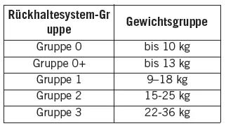 Kinder mit einem Gewicht zwischen 15 kg und 25 kg, die für ein Kinder-Rückhaltesystem der Gruppe 1 zu groß sind, können ein Kinder-Rückhaltesystem der Gruppe 2 verwenden.