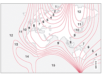 4. Mehrmals auf die Taste drücken, bis die gewünschte Magnetzone (1-15) angezeigt wird, siehe Kompass-Magnetzonenkarte.