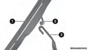 2. Platzieren Sie das Wischerblatt nahe am Haken an der Spitze des Wischerarms mit geöffneter Sperrklinke des Scheibenwischers und der Wischerseite des Scheibenwischers nach oben und von der Windschutzscheibe weg zeigend.
