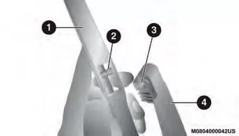 3. Zum Entfernen des Wischerblatts vom Wischerarm fassen Sie mit der rechten Hand das untere Ende des Wischerblatts direkt neben dem Wischerarm. Halten Sie den Wischerarm mit der linken Hand und ziehen Sie das Wischerblatt über den Anschlag hinweg weit genug vom Wischerarm ab, damit der Wischerblatt- Drehstift aus der Aufnahme am Ende des Wischerarms ausrastet.