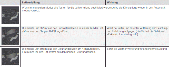 Im automatischen Klimaanlagenbetrieb erfolgt auch die Luftverteilung automatisch. Bei Bedarf kann die Luftverteilung auch manuell gesteuert werden.