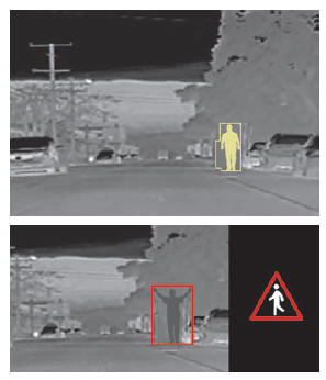 Bei schlechten Außenbeleuchtungsverhältnissen kann das System mithilfe einer Infrarotkamera vorne am Fahrzeug Fußgänger oder Tiere erkennen und im Sichtfeld des Fahrers signalisieren.