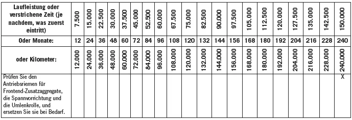 Aus diesem Grund hat Jeep eine Reihe von Kontrollen und Dienstleistungen nach festgelegten Entfernungsintervallen und, wo verfügbar, nach festgelegten Zeitintervallen geplant, wie in der planmäßigen Wartung beschrieben. Damit die Effizienz des Fahrzeugs im Topzustand bleibt, sind in den folgenden planmäßigen Wartungsmaßnahmen einige zusätzliche Prüfungen aufgeführt, die in Bezug auf den normalen Gutscheineinlösungsplan häufiger durchgeführt werden sollten. Planmäßigen Wartungsarbeiten werden von allen Vertragshändlern nach festen Zeit- oder Kilometerstandintervallen angeboten. Wenn bei Betrieb zusätzlich zu den geplanten Wartungen weiterer Ersatz oder Reparaturen benötigt werden, werden diese nur mit der ausdrücklichen Genehmigung des Eigentümers durchgeführt.