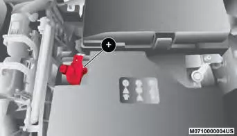 Schließen Sie das Starthilfekabel nicht an den Minuspol (-) der entladenen Batterie an. Dies hätte elektrischen Funkenschlag zur Folge, der zum Explodieren der Batterie und einem Unfall mit schweren Verletzungen führen kann. Verwenden Sie nur den angegebenen Massepunkt, keine anderen blanken Metallteile.