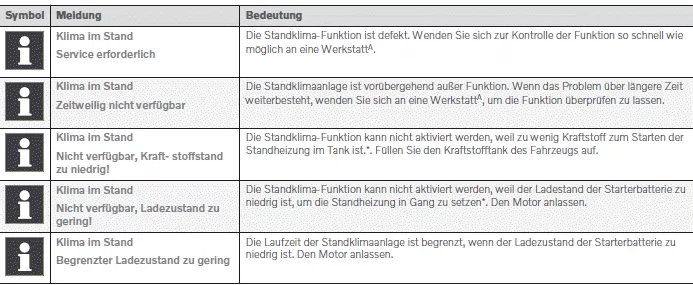 Im Fahrerdisplay können verschiedene Symbole und Meldungen zum Standklima angezeigt werden.