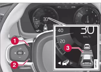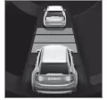 ACHTUNG Wenn das Symbol im Fahrer-Display ein Auto und ein Lenkrad zeigt, dann folgt Pilot Assist einem vorausfahrenden Fahrzeug mit einem vorgewählten Zeitabstand.